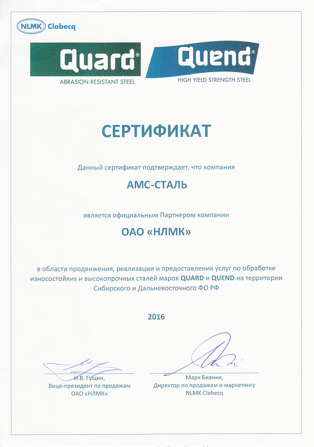 Компания «АМС-Сталь» является оффициальным партнером NLMK Clabecq и предлагает полный ассортимент стали Quard: 400; 450; 500.